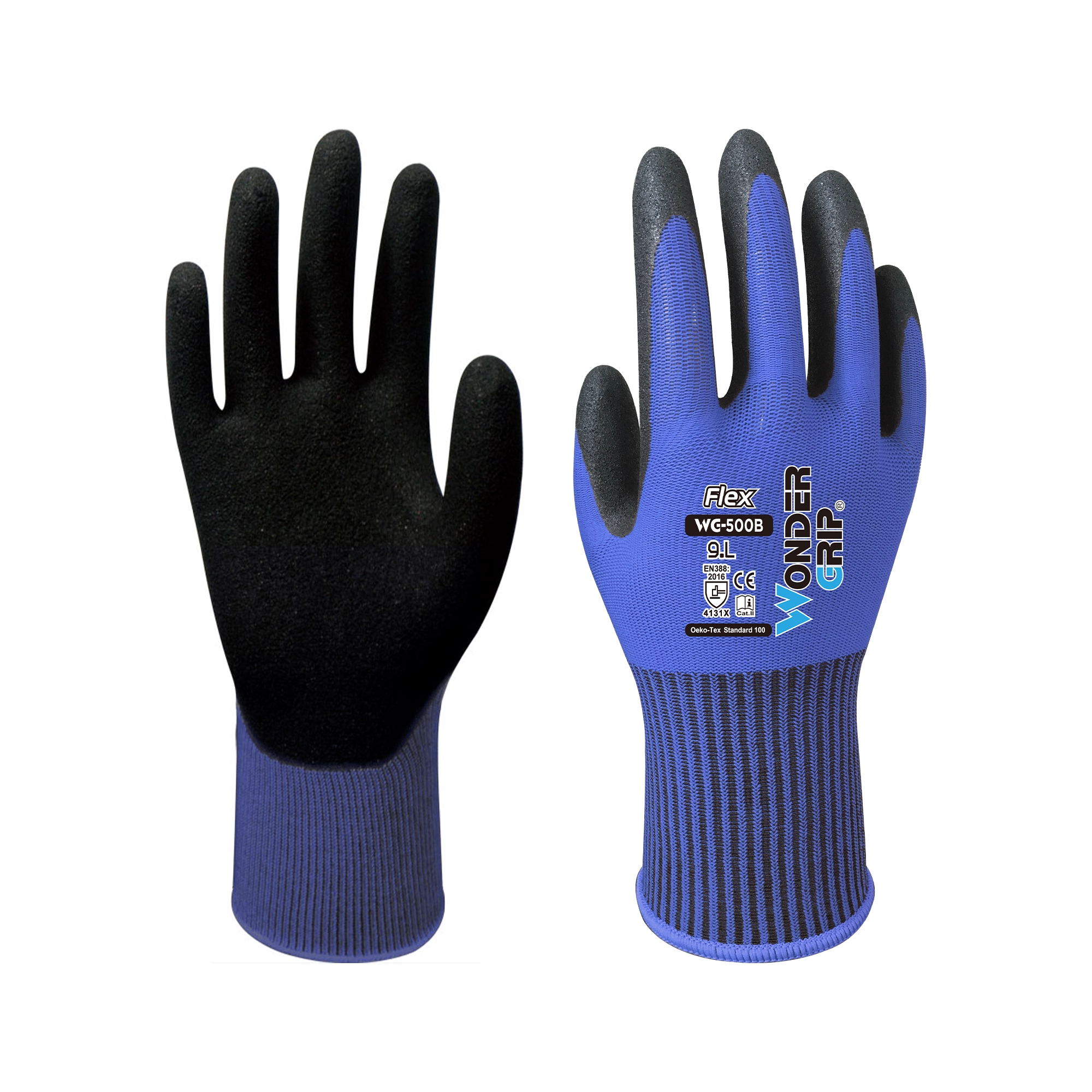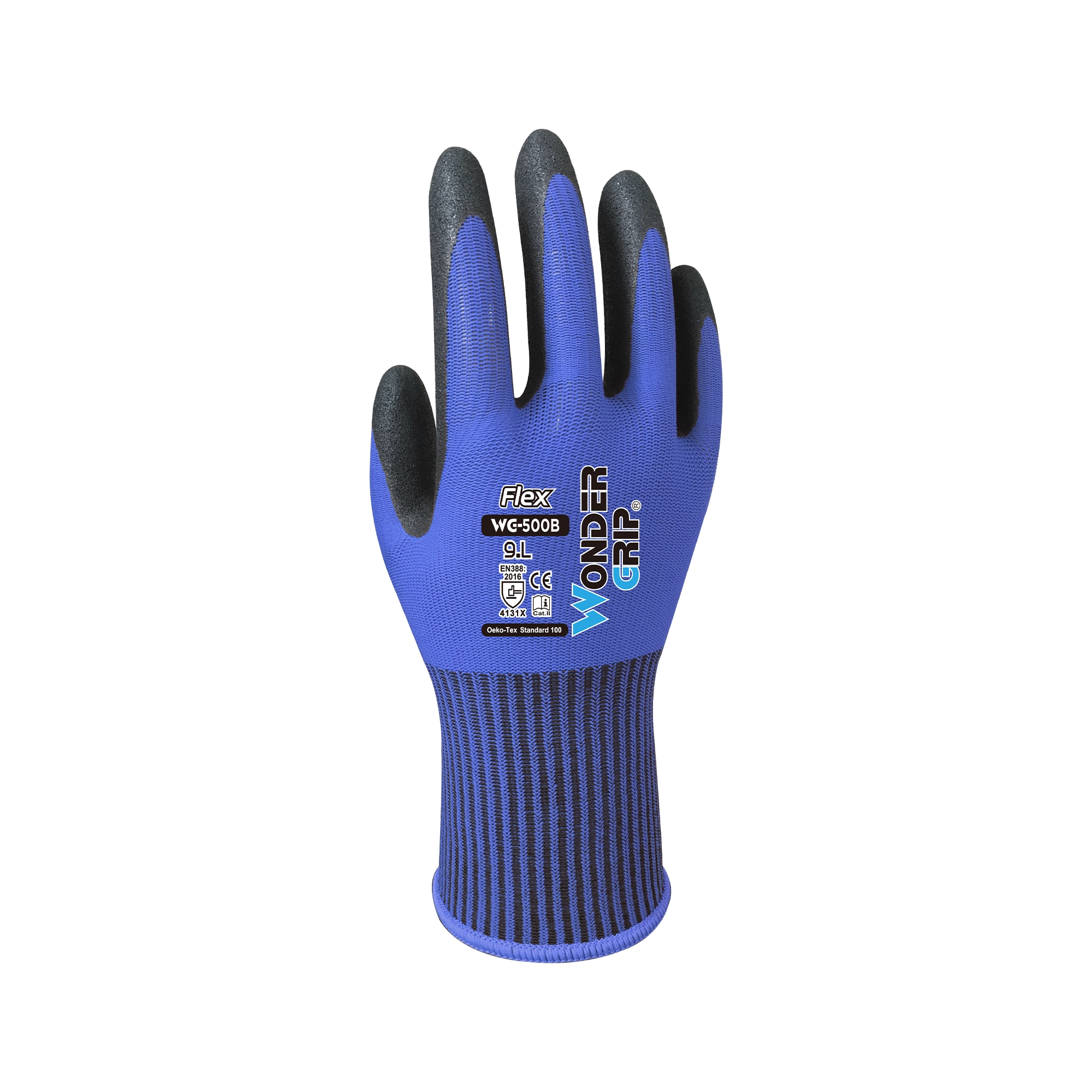 El guante WG-500B Flex cuenta con un revestimiento de nitrilo único sobre un forro de nailon de calibre 13. Este modelo económico está fabricado con la tecnología de revestimiento de microespuma de nitrilo Wonder™ y proporciona un agarre y comodidad excepcionales para numerosas actividades, incluido el ensamblaje de piezas y el almacenamiento. Es el modelo ideal para uso general y asegura un excelente rendimiento en ambientes húmedos, ligeramente aceitosos y sin humedad.